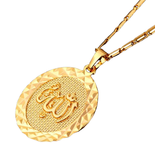 An elegant gold pendant carrying the name of Allah — a symbol of beauty and devotion.
